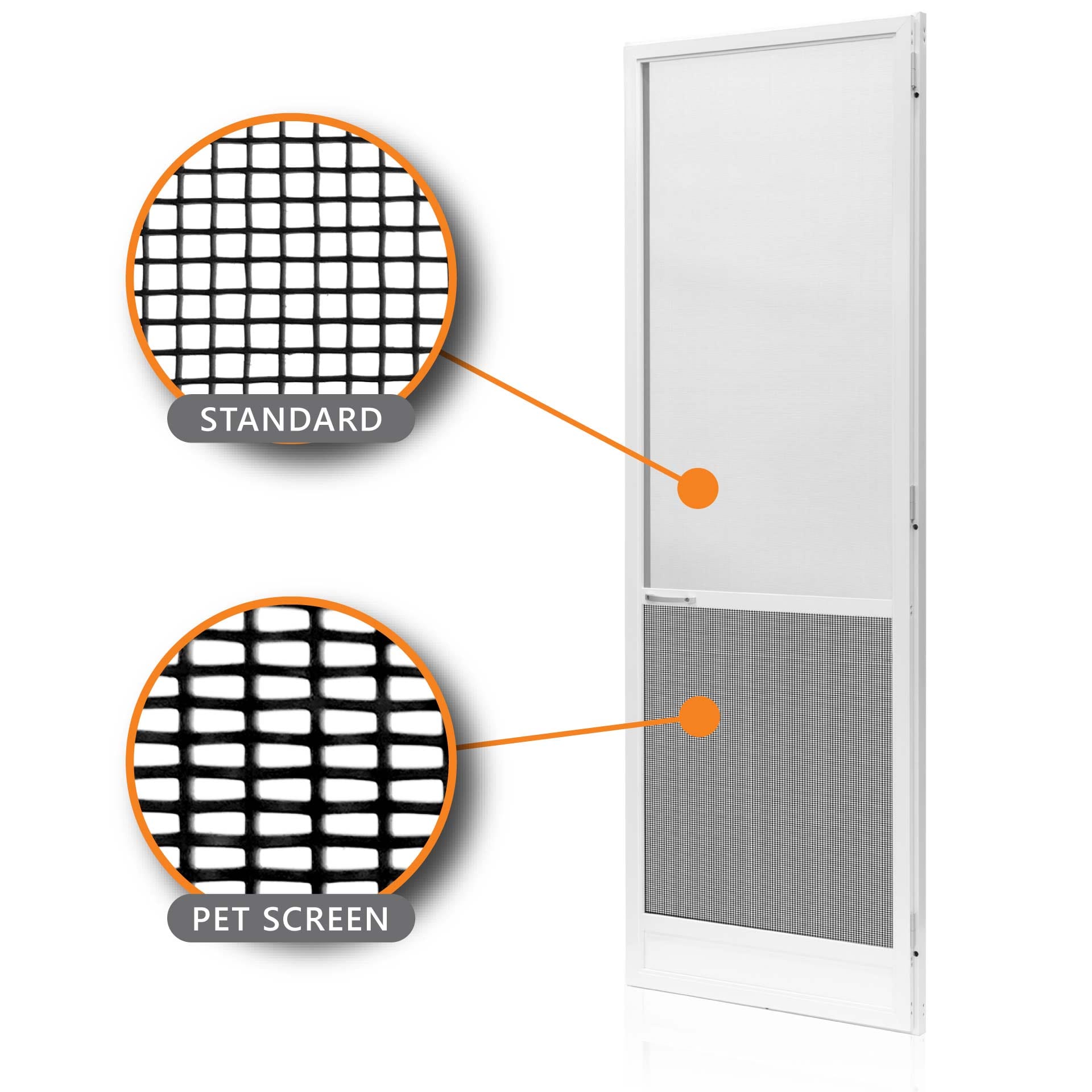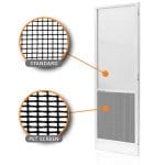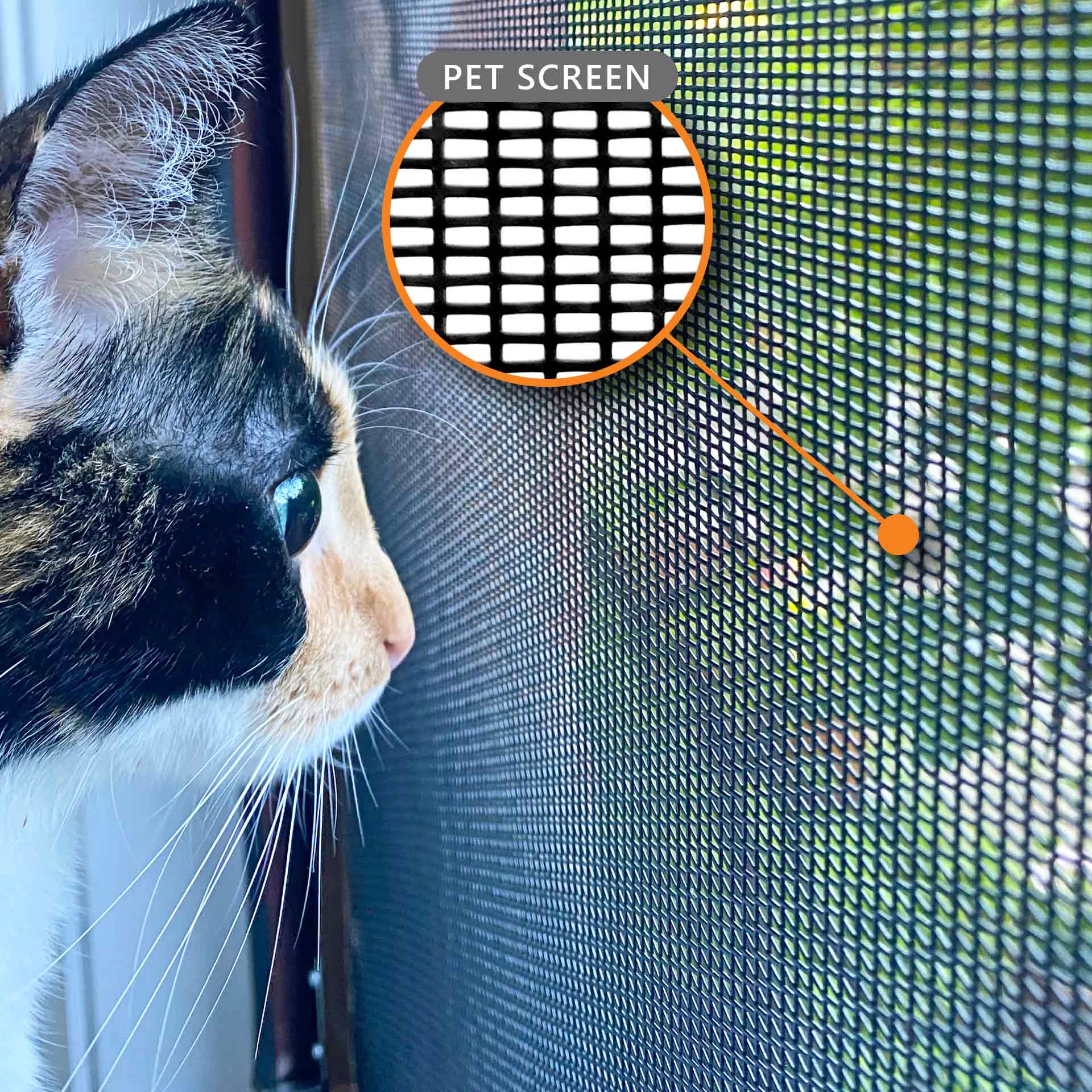Mesh type which is made of extra durable material is much stronger than standard fiberglass mesh and protects the net from pet scratches. With 40% transparency this mesh is more visible and safe for pets. Not only will the pet screen material prevent a pet from escaping, the mesh will also protect your home from outside intruders: insects, birds, rodent, and reptiles.