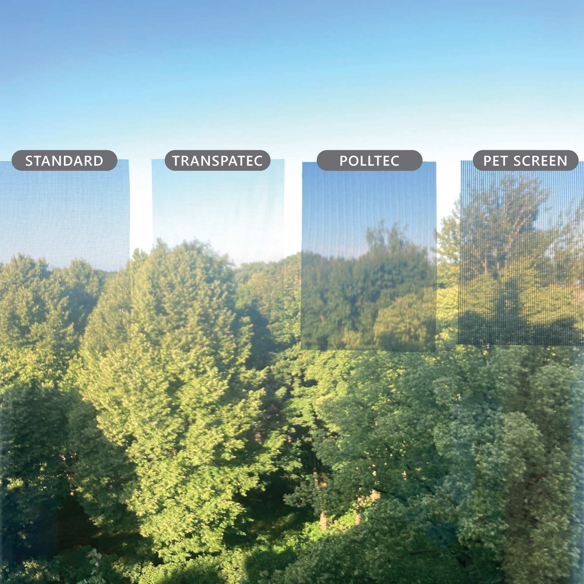 This mesh type is designed for allergy sufferers – in contrast to other conventional mesh types, Polltec has an elongated mesh that is significantly larger on the narrow side than a pollen – this allows more air and light to pass through the fabric. Nevertheless, the pollen gets stuck on the fabric. The special coating is responsible for this, which virtually attracts the pollen and holds it there.