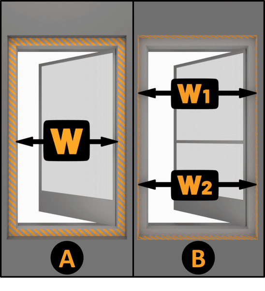 1. Measure the width (W) of the door opening at the top (W1) and bottom (W2). Check that both dimensions are equal, W1=W2. If the measurements differ, the smallest should be used. In this case, the deviation must be compensated with a sealing element when the insect screen door is installed.